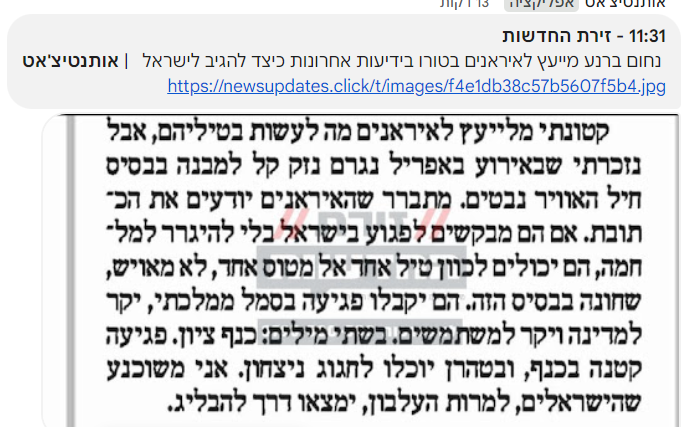 • איומי נתניהו: ראש הממשלה נתניהו הזהיר כי אם איראן תבצע "טעות" ותתקוף את ישראל, היא תפגוש עוצמה שטרם הכירה.