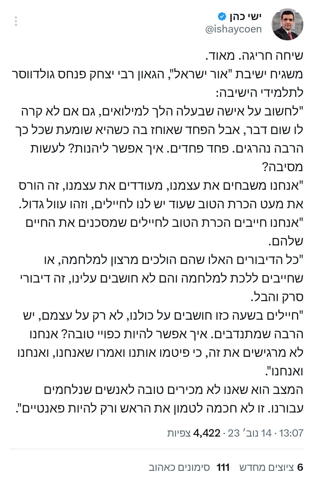 ושוב לא בהאשמה ולא בטרוניה אלא כנתון מציאותי