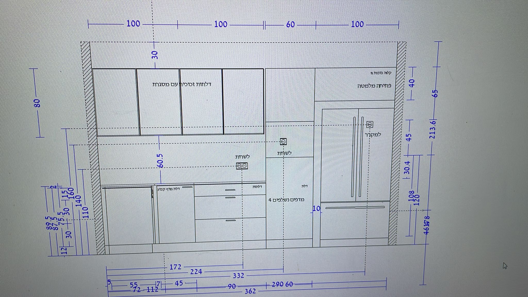 מעלה לך סקיצה מדויקתהצהוב - זה דלתות לבנות עם דיות חריצם.הסגול זה מגרותהתכלת זה תאים מעץהאפור זה ארונות עליוניםדייקתי ממש את המידות אשמח שתיקח את הסקיצה ותשמור על קנה מידה