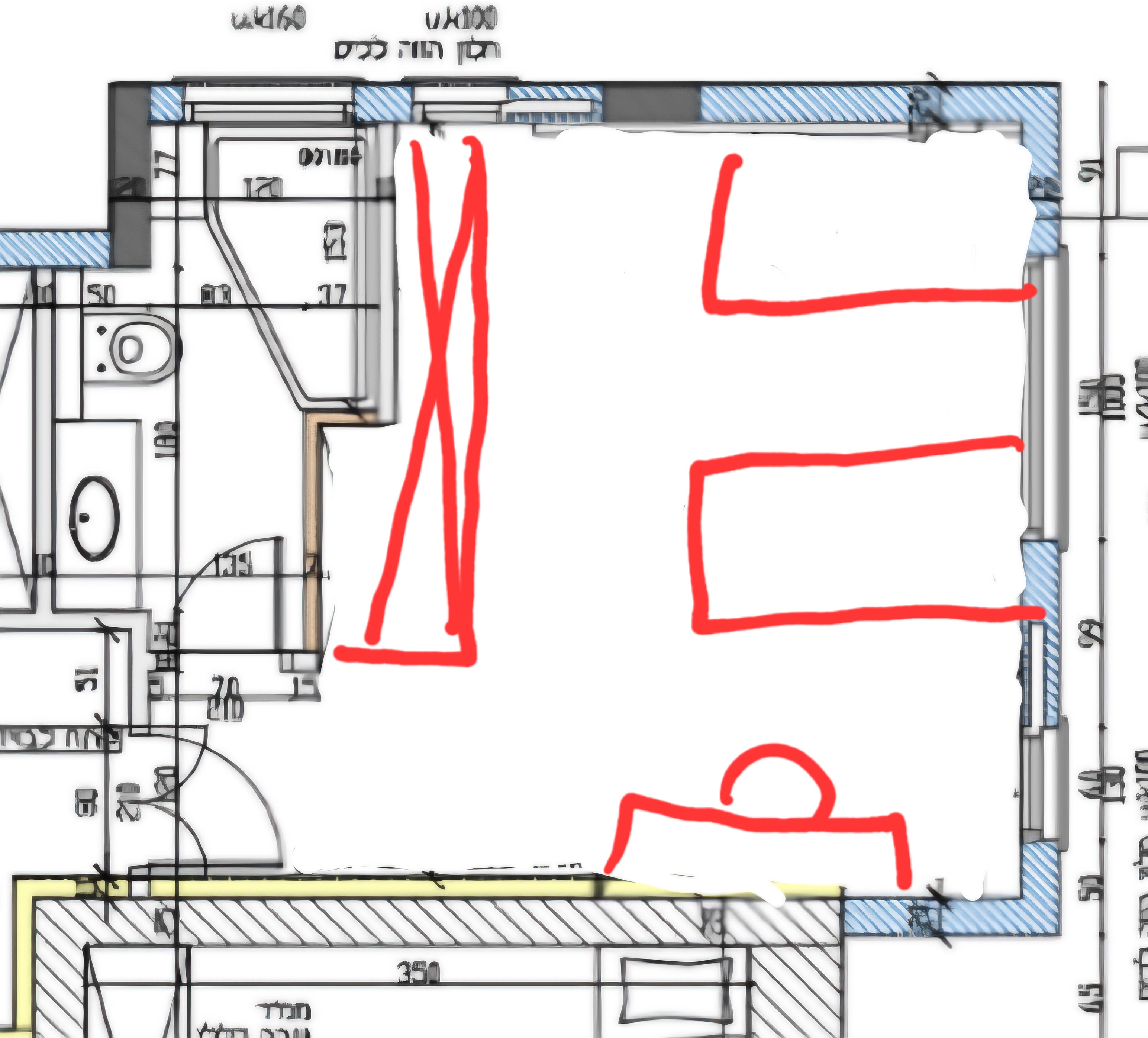 ויש שם חצי חדר שינה - הקיר שצמוד למטבח שלי - שאותו אני רוצה להגדיל לחדר נורמלי 2 מיטות ארונות ושולחן אולי וכו.