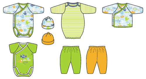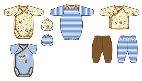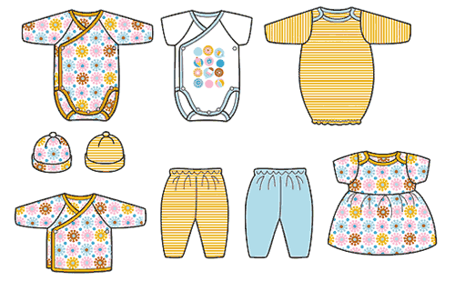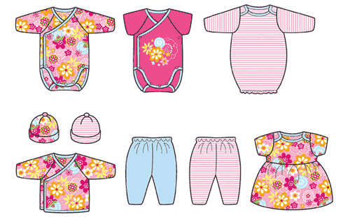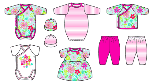תינוק תינוקות בגד בגדים שמלה שמלות בגד גוף כובע כובעים מכנס מכנסיים בן בנים בת בנות איור איורים