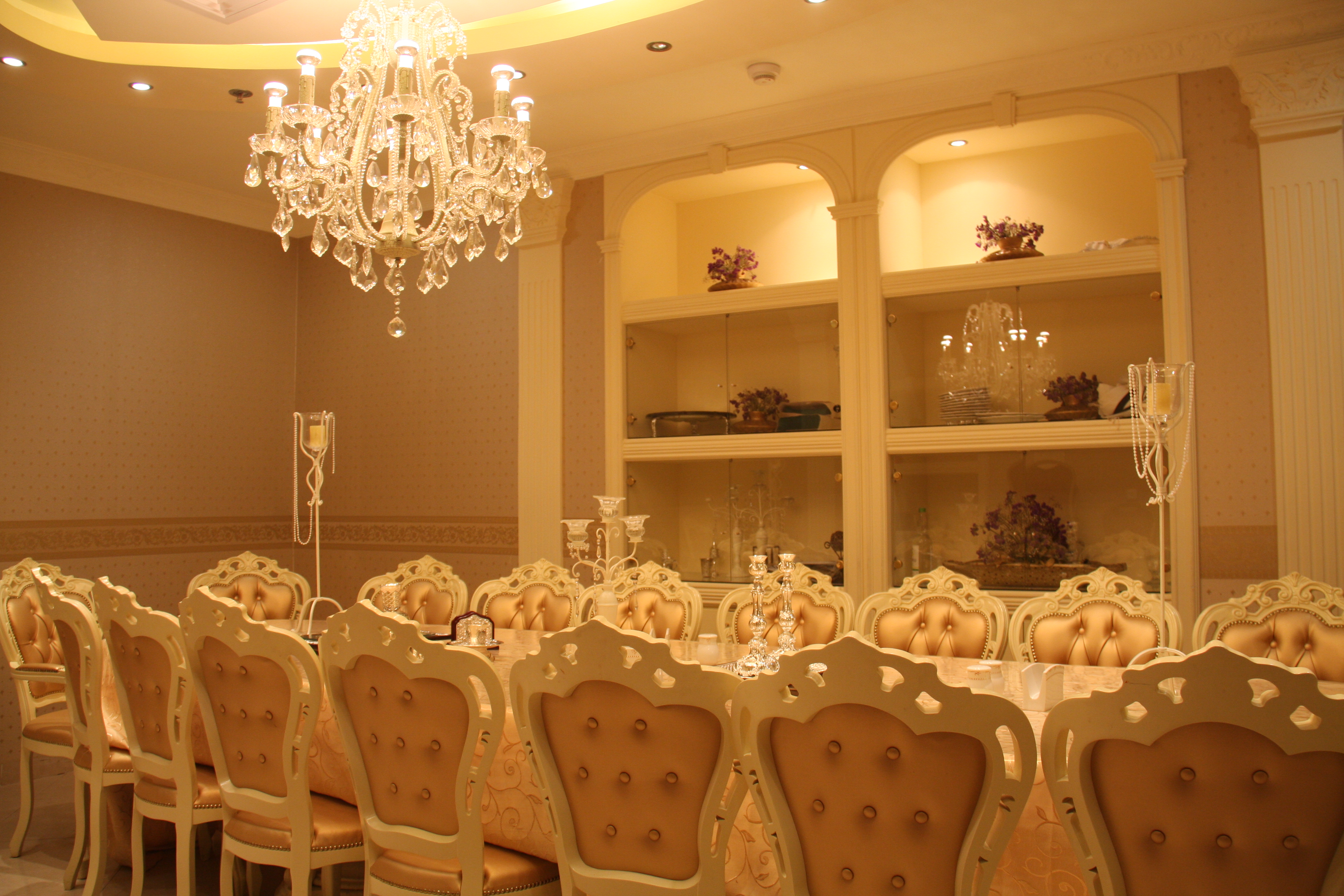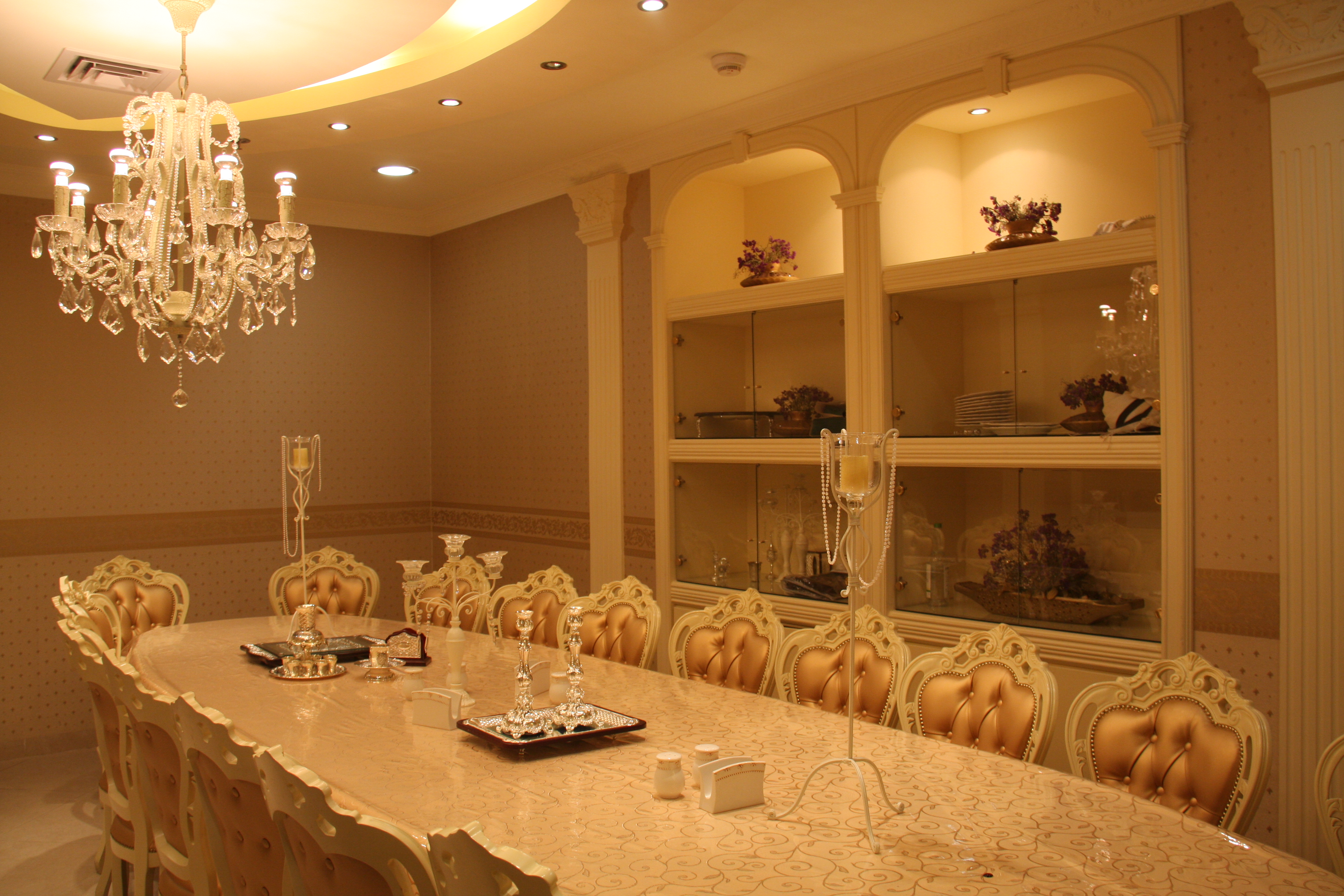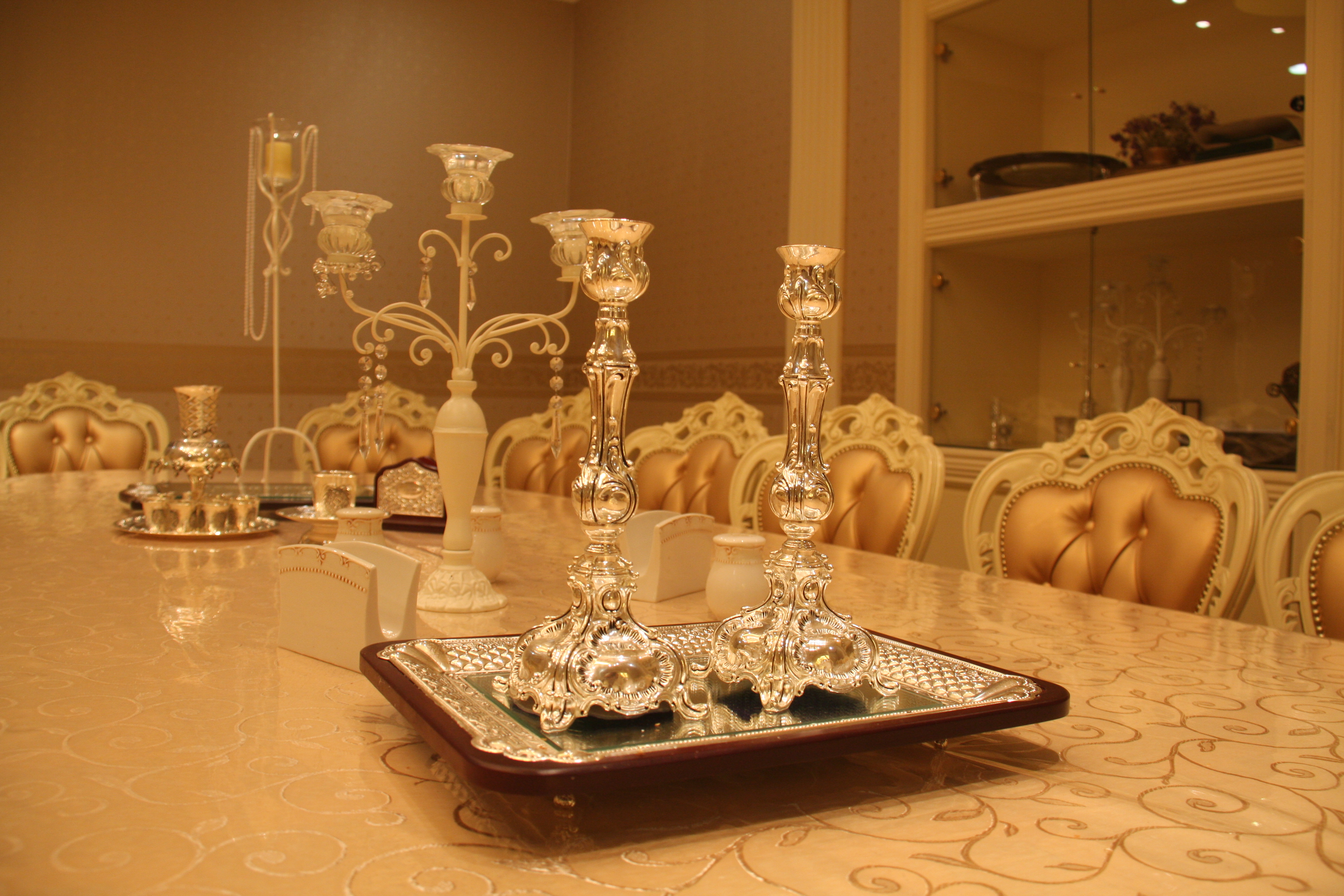 שולחן שבת מפואר, פמוטות, שנדליר, תאורה