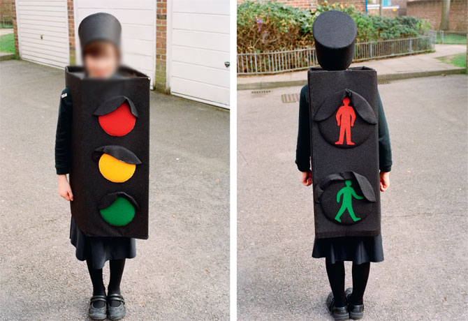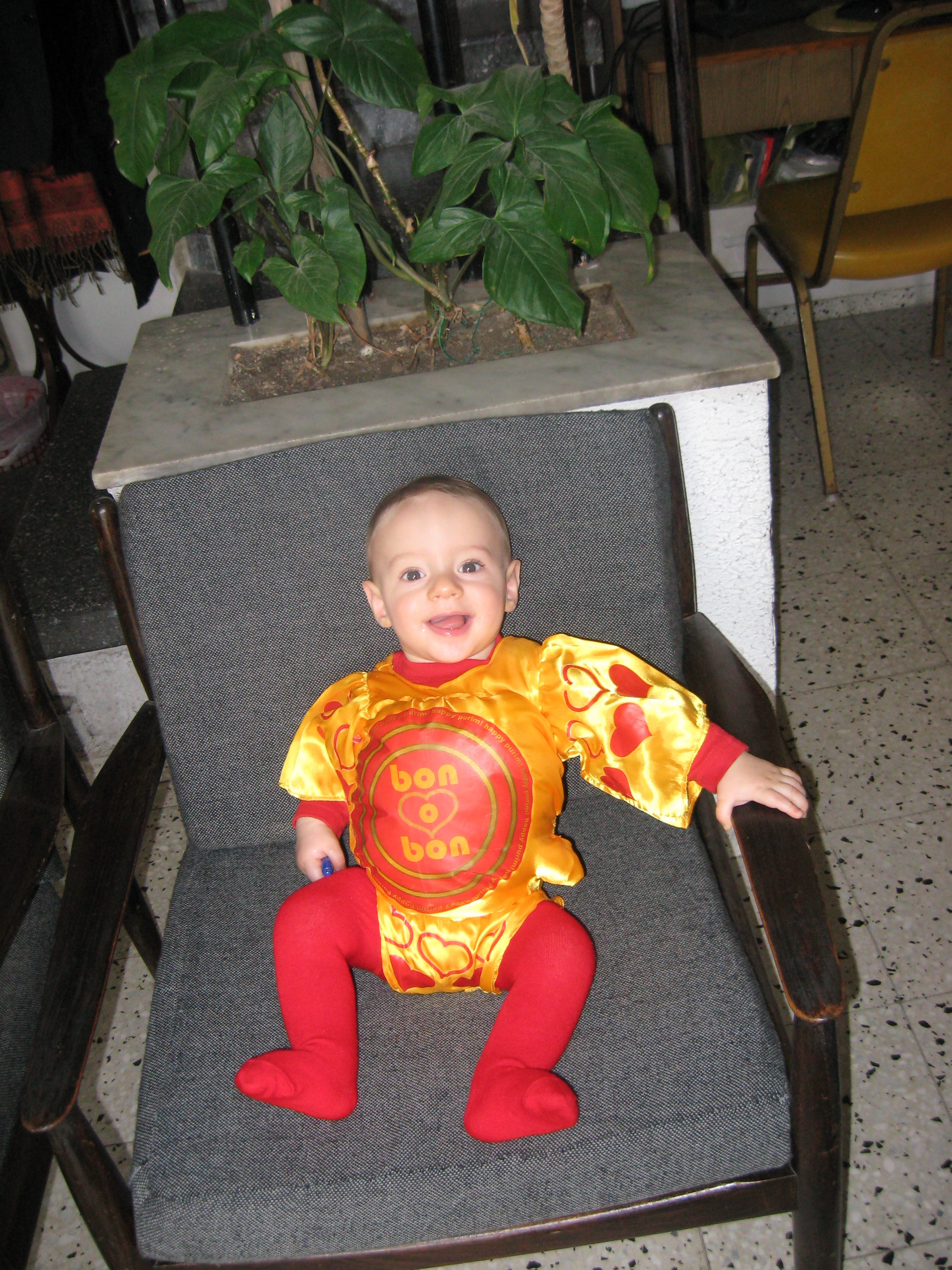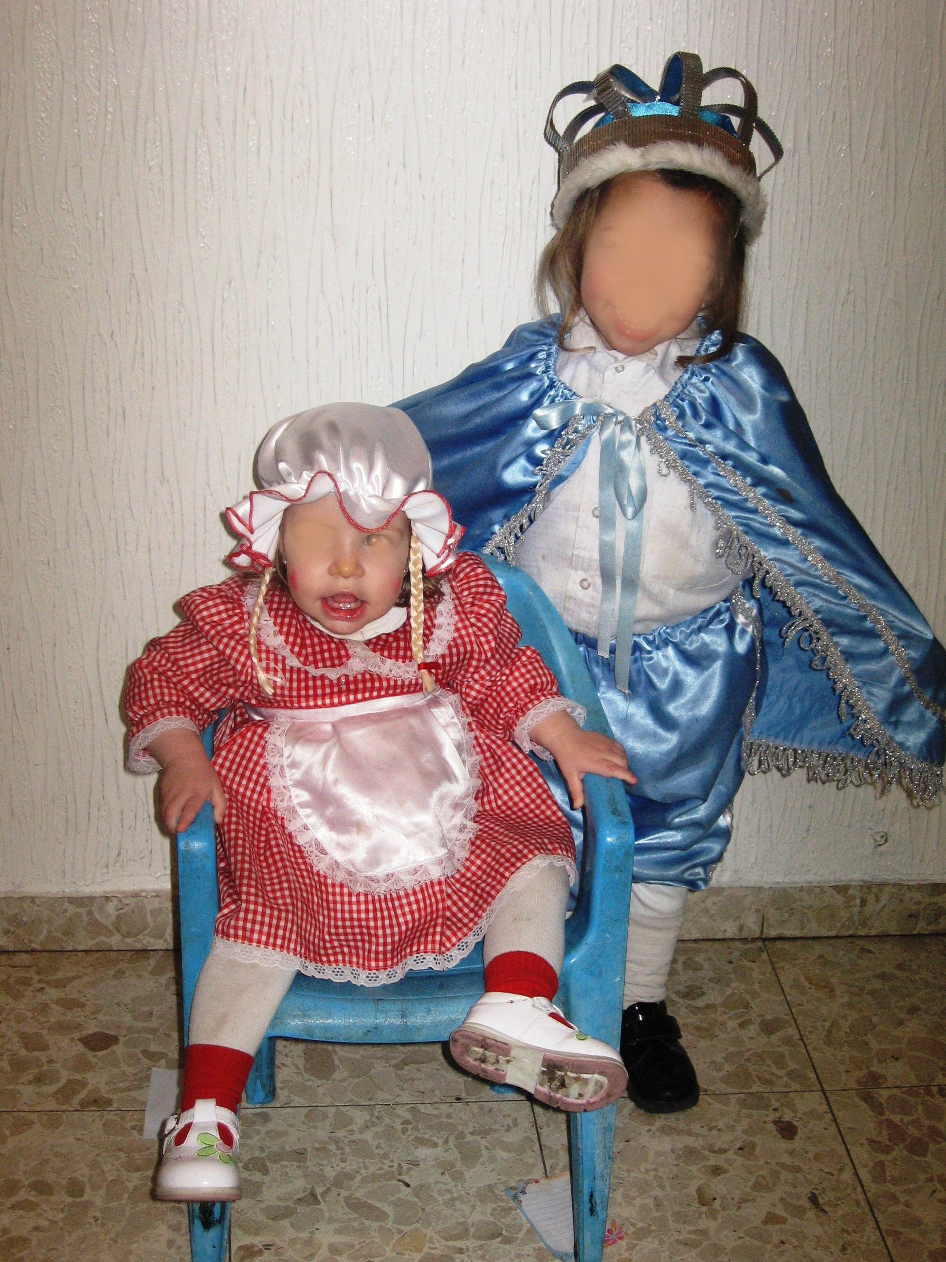 אני חיפשתי את הבן שלי בן ארבע לחזן. לקחתי כובע שחור של אשה ומילאתי אותו בחומר מילוי כך שזה קיבל גובה. חולצה לבנה וסט אלגנטי שקניתי בסופר שיין ומכנסיים שחורים אלגנטיים. טלית יצרתי מציצית צמר ישנה והיה לו רמקול ביד והכל היה מושלם. הרעיון כולו של גיסתי.
