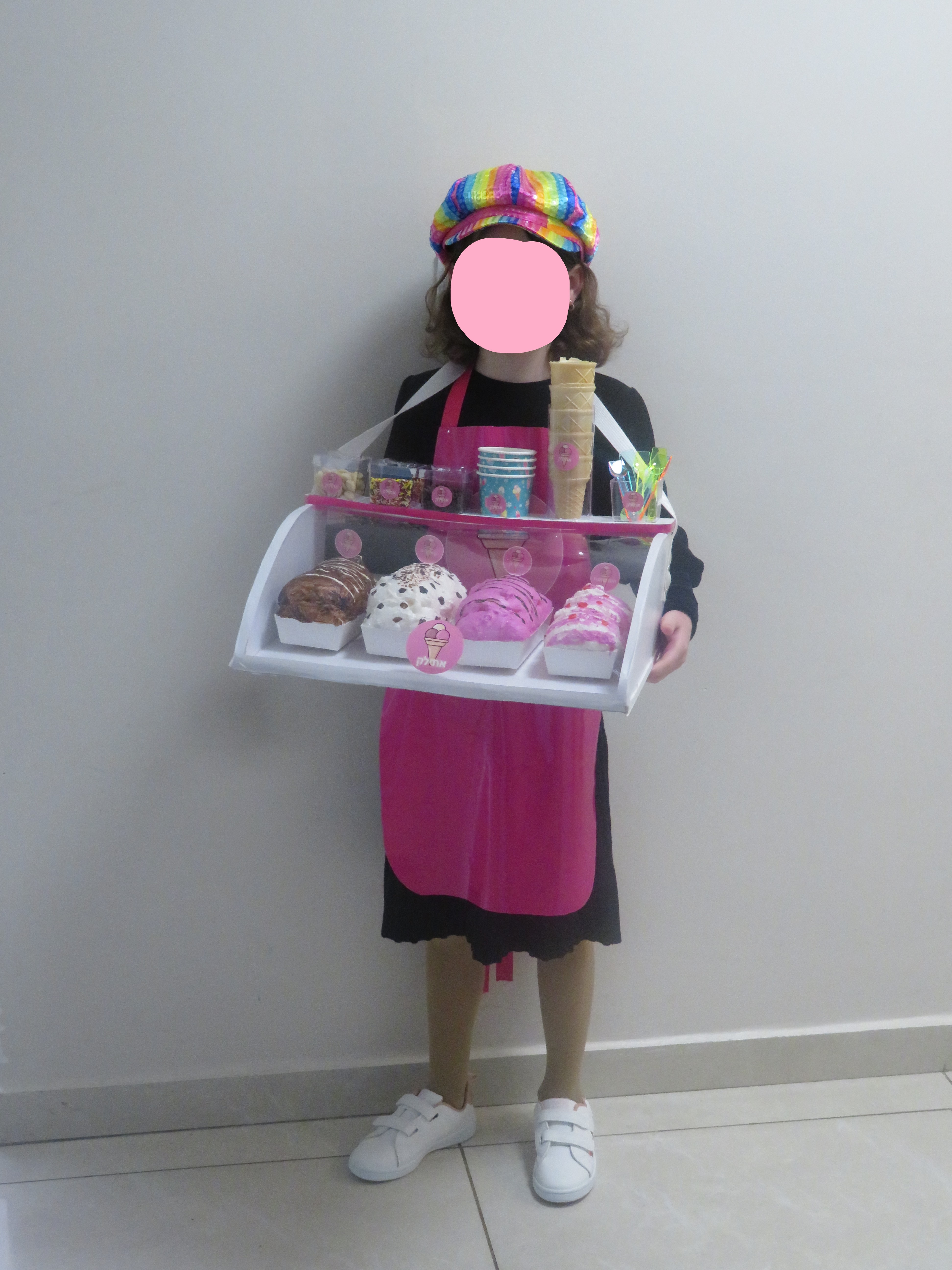 למכירה ארבע תחפושות מושקעות לילדות בגילאי 7-10: מוכרת גלידה, מוכרת מזכרות מלונדון, רוקחת, אופטיקאית.