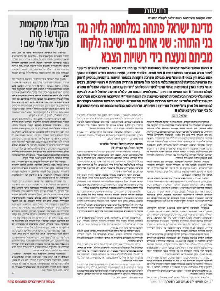 כי ברוך יצחקוב בוגר הישיבה נעצר כבר בפורים האחרון ונגזרו עליו 14 ימי מאסר בכלא הצבאי. כעת, כאמור, נעצר פעם נוספת, הפעם יחד עם אחיו, והם שוהים במעצר.