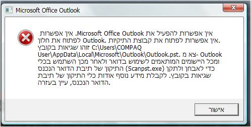 ניסיון פתיחה של אאוטלוק מעלה לי את הודעת השגיאה המצ"ב וסוגר את התוכנה מיד. מה עושים?