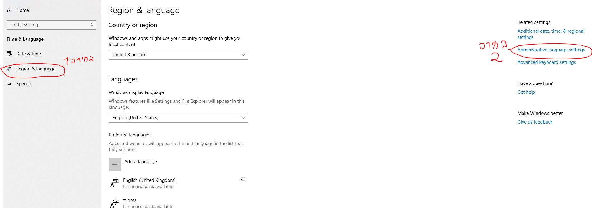 בתוך הגדרות שעה ושפה תבחר הגדרת אזור ושפה - תבחר מנהל הגדרות שפה