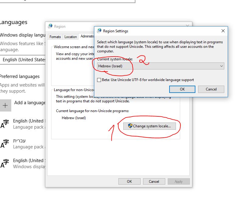 יפתח לך חלון עם כותרת הגדרות אזוריות או משהו דומה בפנים יש לך לבחור מנהל הגדרות שפה לשפות שהם לא יוניקוד (Non-UniCode) תלחץ על זה ותבחר עברית (ישראל) והכל יסתדר בעז"ה.