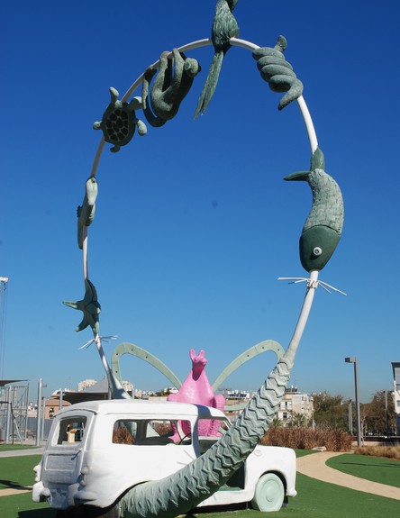 כשנתקדם מבריכת הנוי לאורך השביל בפארק הפונה מזרחה נבחין בפסלי אמנות רבים. בין הפסלים הפזורים בשטח: אדם כלוא בתוך דג (אולי רמז ליונה הנביא בתוך הלוויתן), שמשון הממוטט עמודים (תמות נפשי עם הפלשתים), זוג בעלי ראש דמויי תרנגולת הדוחפים עגלת תינוק, משפחת ג'ירפות ועוד.