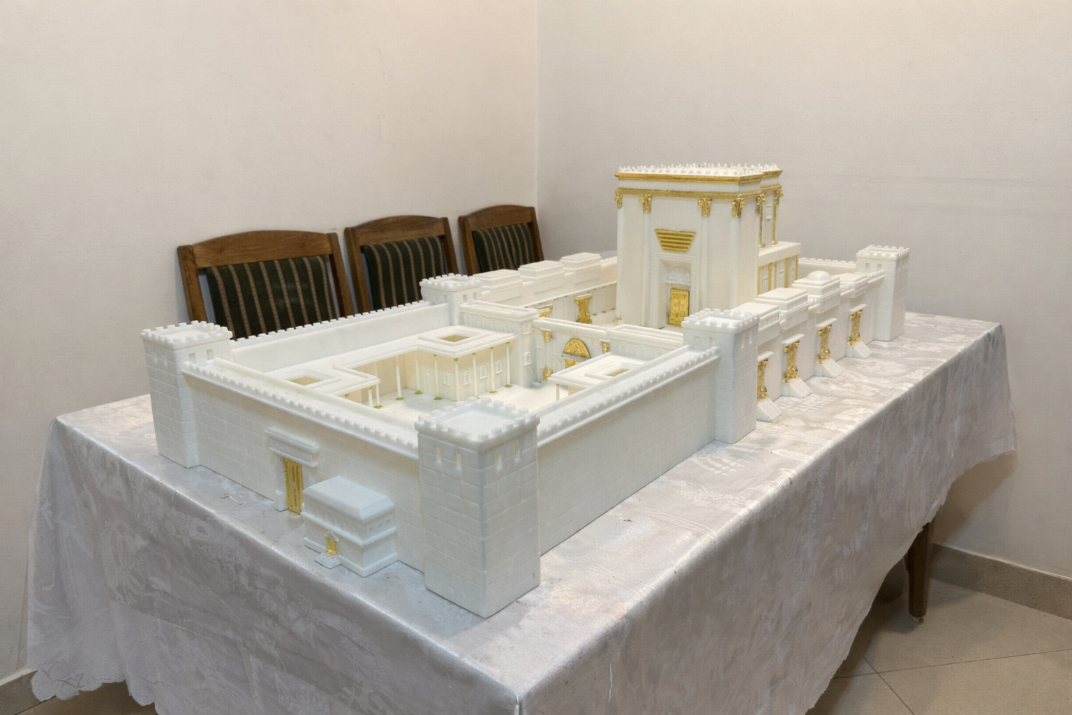 המודל בנוי בדיוק מירבי לפי המידות בהלכה, וכולל פירוט של המבנים, החומות והעזרה, עם גימור יוקרתי וציפוי עלה זהב אמיתי שהודבקו בעבודת יד✨