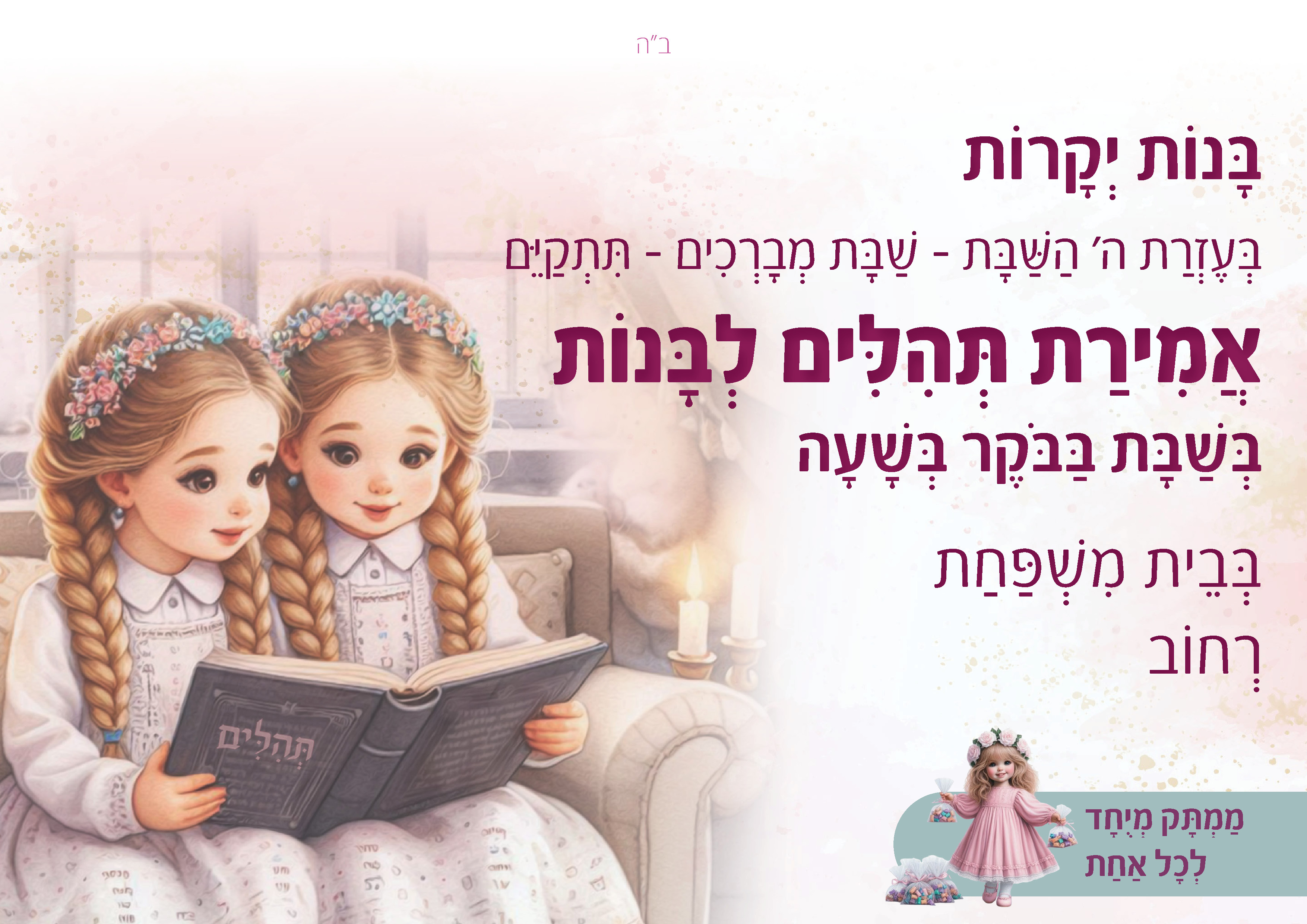 לכבוד שבת מברכין אייר, ובעקבות יוזמה מרגשת של אמירת תהילים לבנות, יצרתי רקע גרפי עדין ומתוק, שמתאים במיוחד למודעות של "חברת תהילים לבנות".