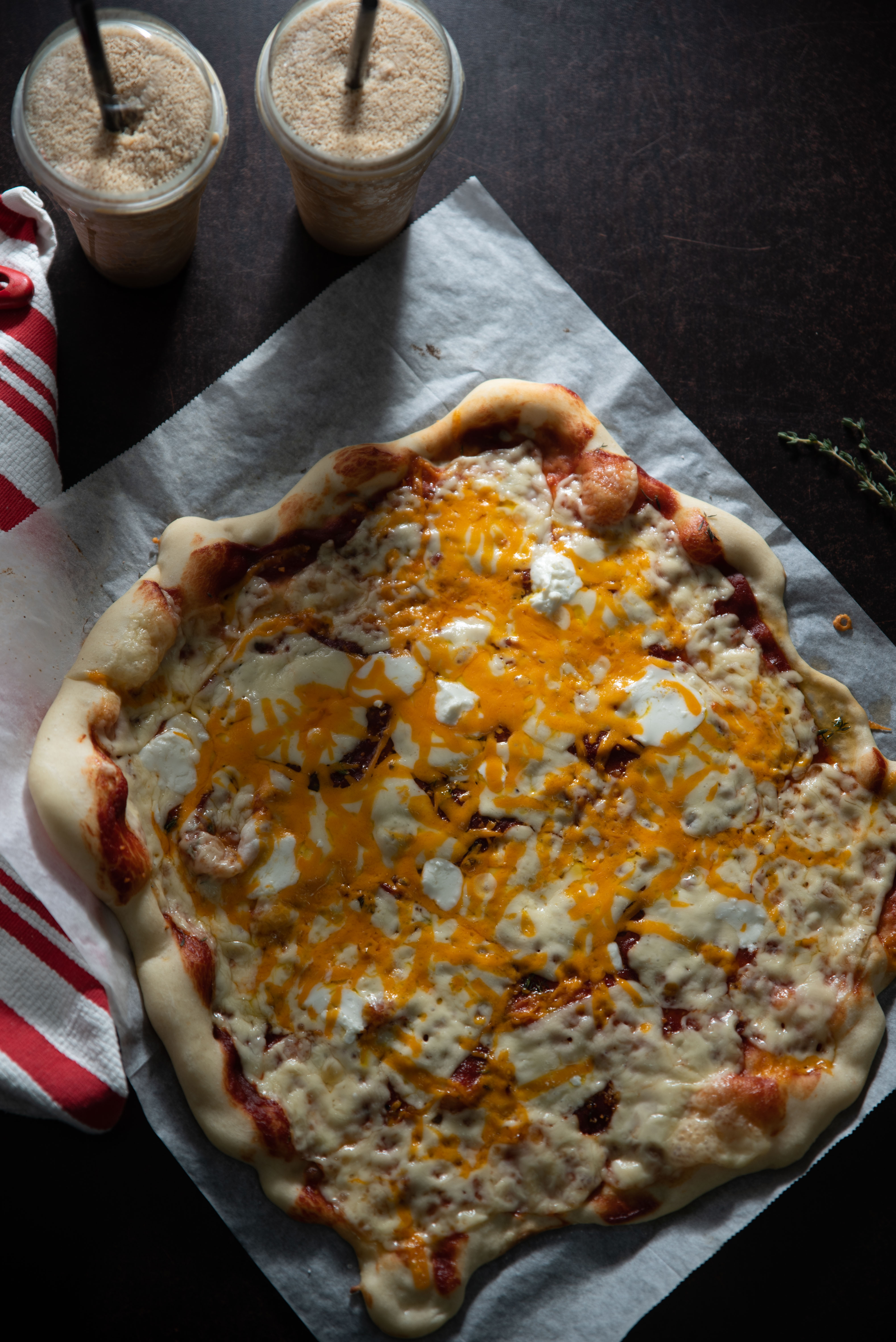 כשהפיצה מוצאת מן התנור, לוקחים כף ומעבירים בחוזק על הנייר אפיה שמלמעלה כך שהגבינה החמה (מה שעדיין לא התפשטה) כך הכל נהיה מרוח בשווה.