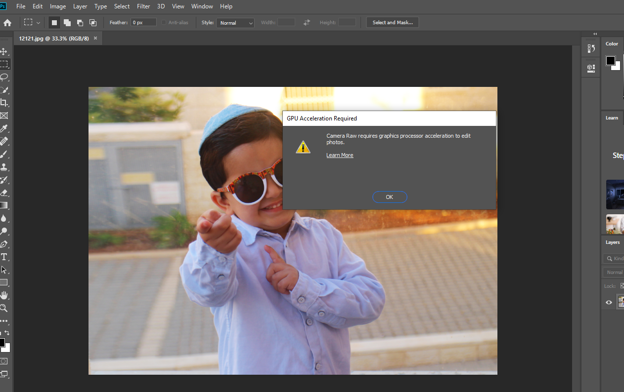 המחשב שלי קרס לאחרונה וביצעתי אצל טכנאי התקנת ווינדוס מחדש וכן התקנת התוכנות, וכרגע כשאני מנסה להשתמש באופציה של CAMERA RAW FILTER הוא מוציא לי שגיאה בקשר למעבד הגרפי.(מצ"ב)
