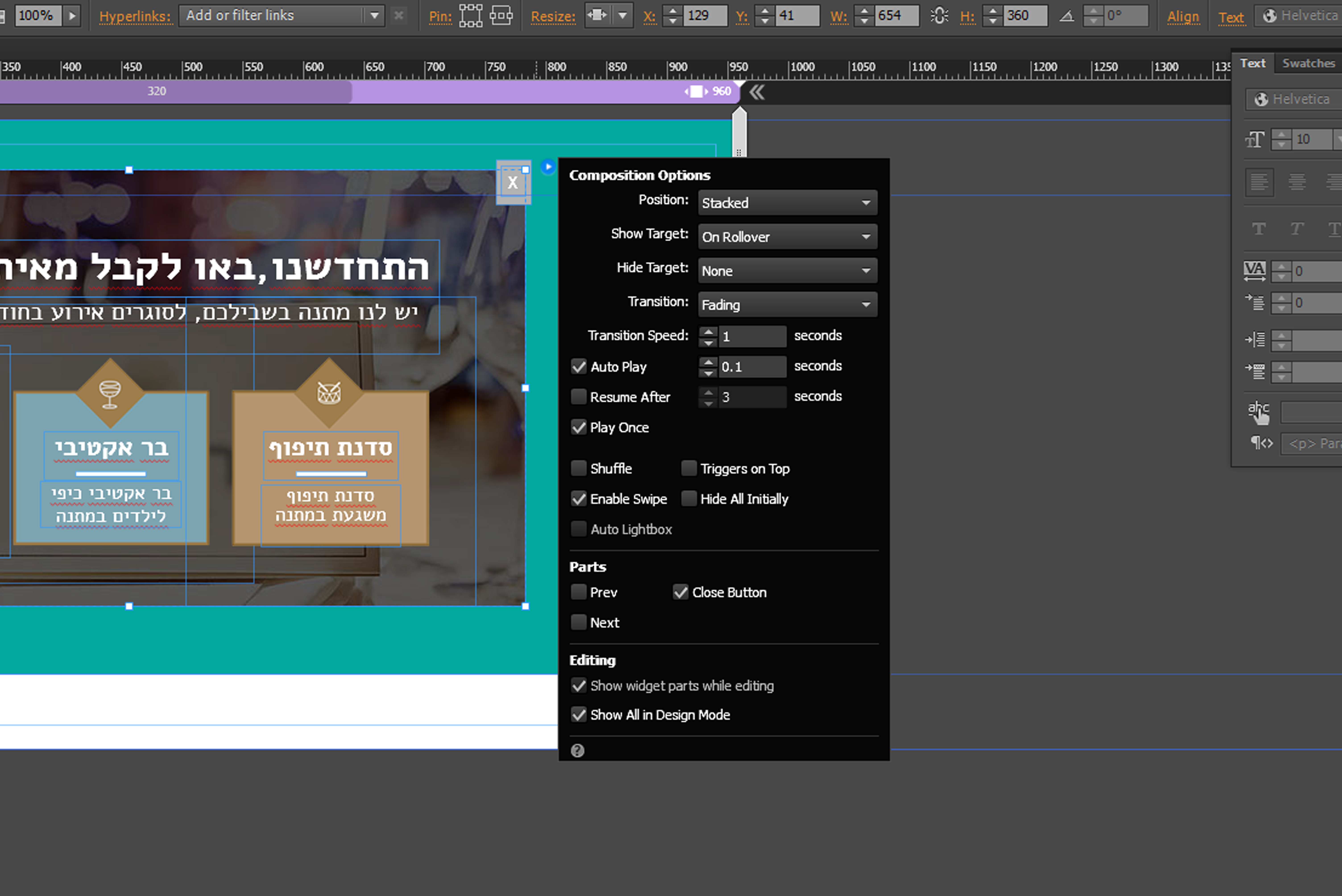 אני מנסה לעשות פופאפ במיוז שיופיע מיד כשנכנסים לאתר, השתמשתי בwidget של composition ואני לא יודעת איזה פרמטרים לבחור כדי שיופיע אחרי טעינת הדף ויעלם אחרי שלוחצים x , אשמח לעזרה:)