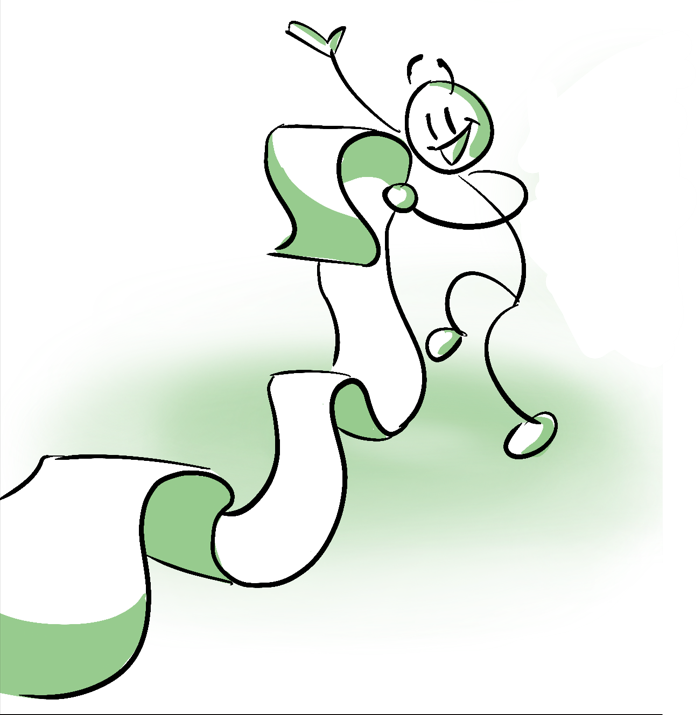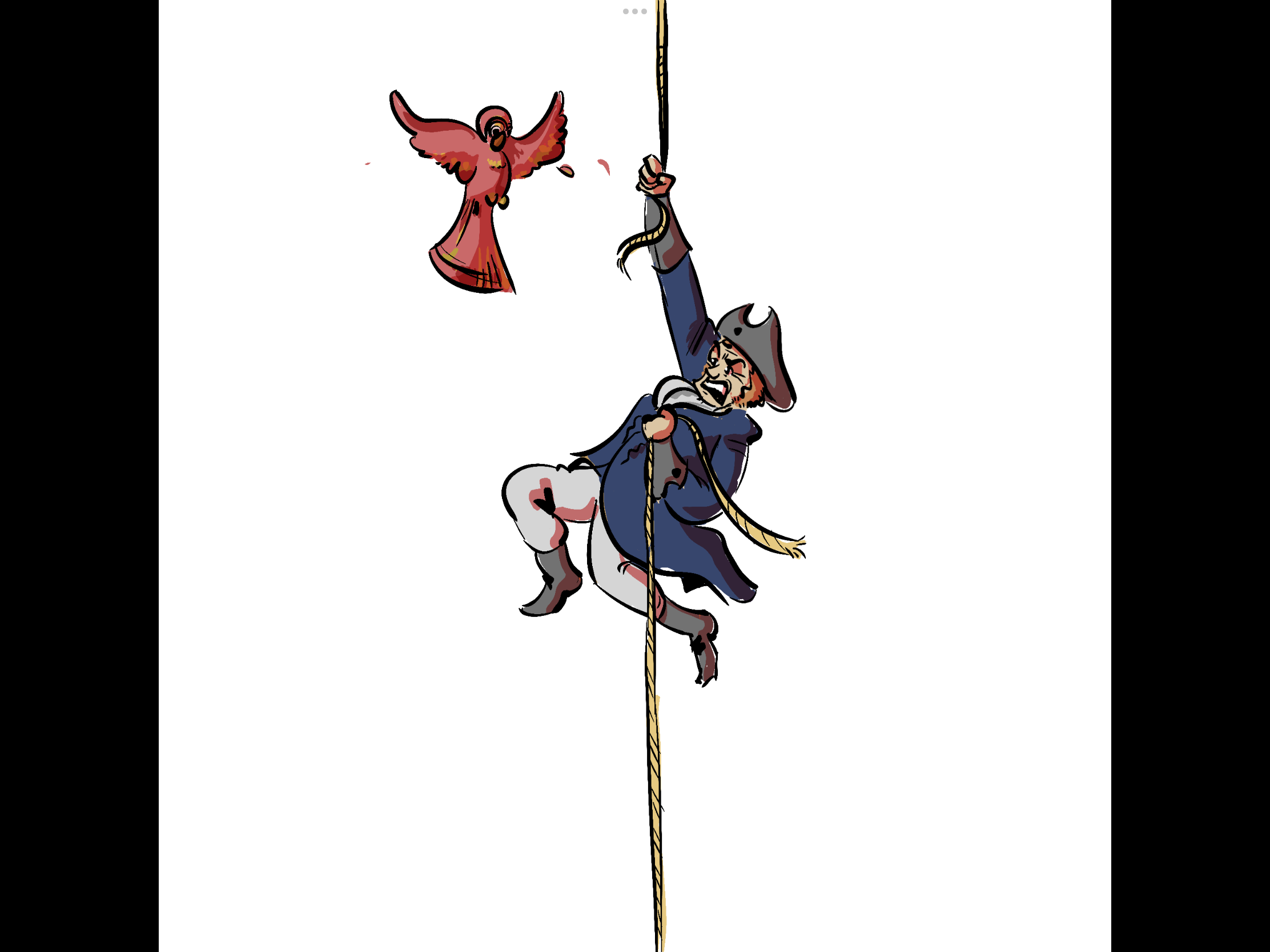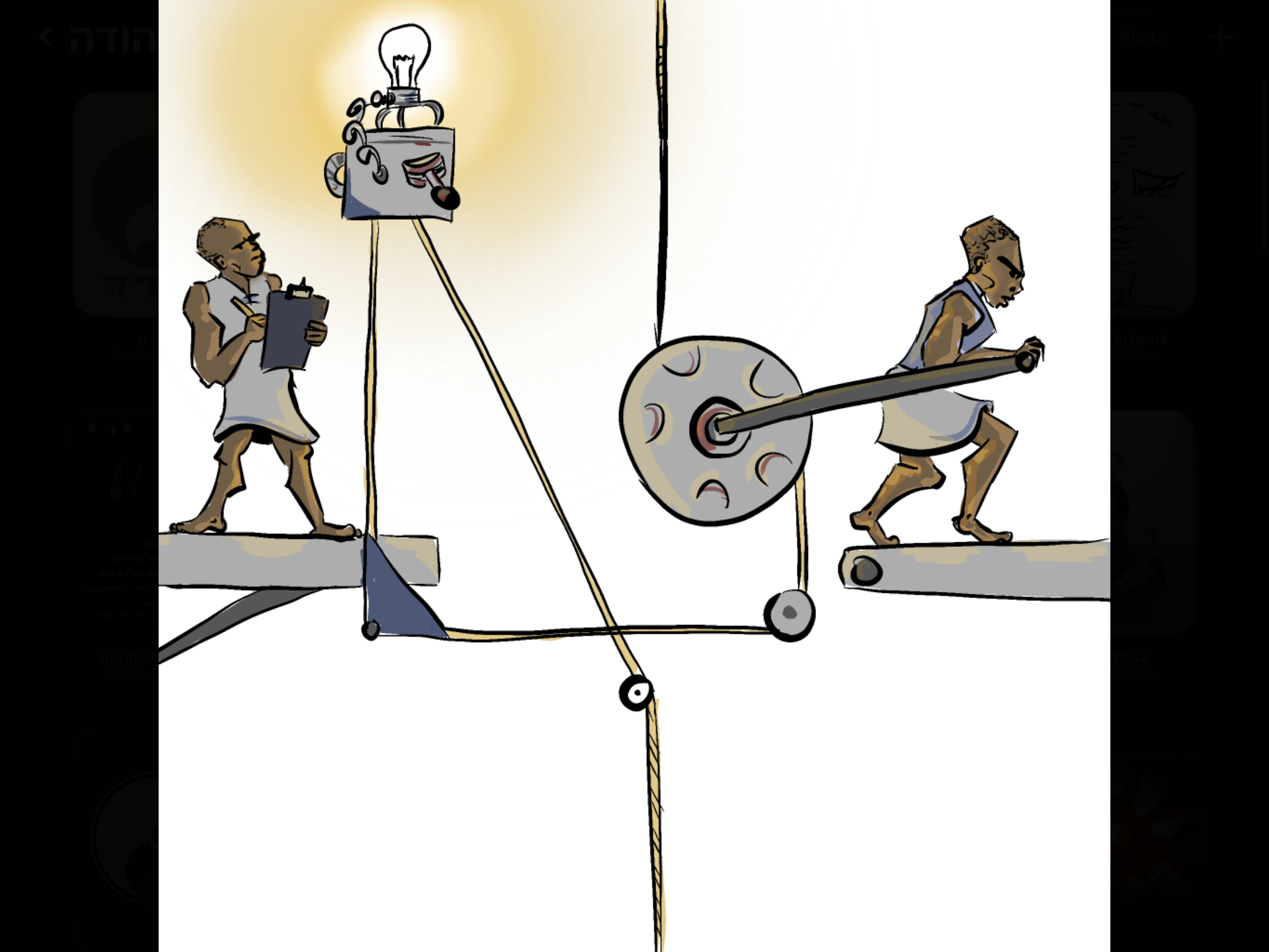 בראש הדף מבצבץ קצה חבל, ובתחתית הדף אפשר לראות את קצה החבל יוצא מהדף אל עבר הציור הבא.